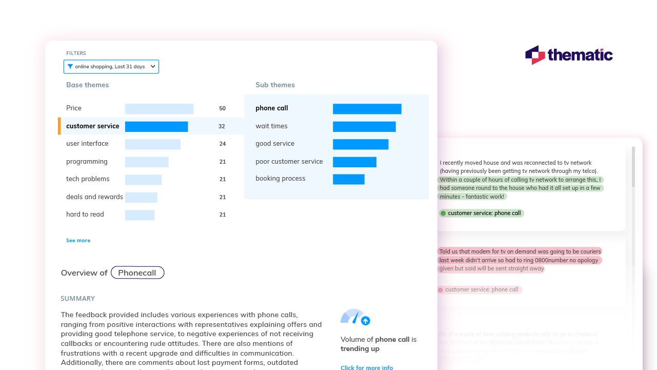 With AI-powered thematic analysis solutions like Thematic, you can turn themes into concrete and actionable insights. This means you can make better business decisions based on real customer experiences, thoughts, and opinions. For example, if a common theme in customer feedback is "poor service," the actionable insight might be to invest in better staff training. You can also easily share your findings with stakeholders, colleagues, or clients through customizable reports and presentations.