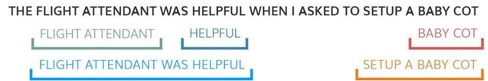 Given a piece of feedback such as, “The flight attendant was helpful when I asked to set up a baby cot,” it would extract themes such as “flight attendant,” “flight attendant was helpful,” “helpful,” “asked to set up a baby cot” and “baby cot.”